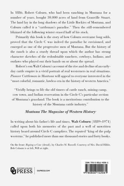 A vivid portrait of ranchers cowboys, Indans, and outlaws in the West In 1886, Robert Coburn bought 30,000 acres of land from Granville Stuart. The tract lay in the long shadows of the Little Rockies of Montana, and Coburn called it a "cattleman's paradise." Then the still-remembered blizzard of the following winter erased half of his stock. This is the story of how Coburn overcame long odds, proved that the Circle C was, indeed, the "paradise" he envisioned, and emerged as one of the progressive men of Montana. Coburn had a brief but memorable encounter with Chief Joseph of the Nez Perces in 1877. As always in the frontier country, men were sometimes on the side of the law, sometimes on the outside of the law. Among these were Pike Landusky, the notorious Kid Curry and his brothers, Jim Winters, and Charles Siringo. Artist Charles M. Russell was also a visitor to the Circle C. Pioneer Cattleman in Montana will appeal to everyone interested in the "most colorful, romantic, lawless era in the history of western America." Walt Coburn, in writing about his father's life and times, called upon both his own memories of the past and a well of unwritten history heard around Circle C campfires. He was the author of many popular western novels and stories, including "Old Yeller."