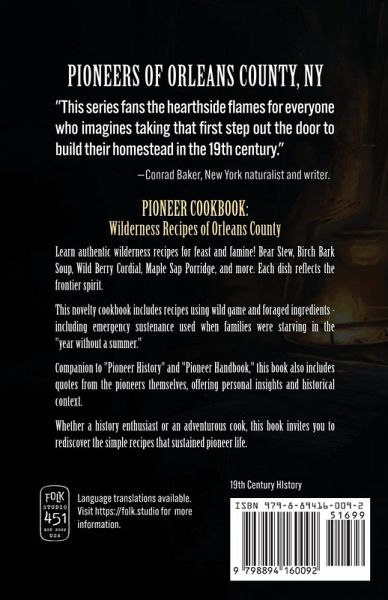90+ authentic wilderness recipes for feast and famine, using wild game and foraged ingredients, like Bear Stew, Beech Bark Soup, Wild Berry Cordial, and Maple Sap Porridge. Some were used by starving families in the "Year without a summer."