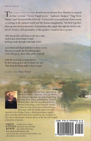 Ross Thurber's poems have appeared in Bloodroot Literary Magazine, Chrysalis Reader, and Vermont Life; they are anthologized in So Little Time: Words and Images for a World in Climate Crisis, edited by Greg Delanty, and published by Green Writers Press in 2014. He was awarded an Emily Mason Fellowship at the Vermont Studio Center in 2012. Ross lives in Brattleboro, Vermont, with his family and owns and operates Lilac Ridge Farm, a third-generation organic dairy and diversified hill farm nestled in the foothills of the Green Mountains. Ross began the farm's transformation to all certified organic production in 1996, returning to the farm a year after graduating from the University of Vermont with a self-designed agriculture concentration and degree. Ross Thurber and his family are featured in the article, "One Day This Will All Be Yours," which appeared in Vermont Life Magazine. His first book-length collection, Pioneer Species , published by Green Writers Press, will be available this April.
