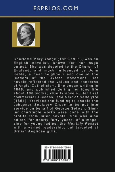 Charlotte Mary Yonge (1823-1901), was an English novelist, known for her huge output. She was devoted to the Church of England, and much influenced by John Keble, a near neighbour and one of the leaders of the Oxford Movement. Her novels reflected the values and concerns of Anglo-Catholicism. She began writing in 1848, and published during her long life about 100 works, chiefly novels. Her first commercial success, The Heir of Redclyffe (1854), provided the funding to enable the schooner Southern Cross to be put into service on behalf of George Selwyn. Similar charitable works were done with…mehr