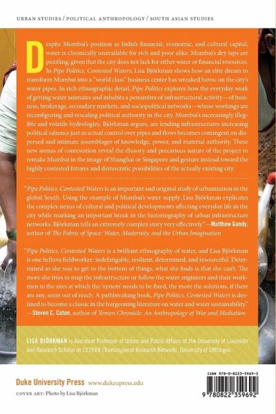 In Pipe Politics, Contested Waters, Lisa Bjà rkman explores why water is chronically unavailable in Mumbai, India's economic and financial capital. She attributes water shortage to economic reforms that allowed urban development to ignore the water infrastructure, which means that in Mumbai, politics is often about water.