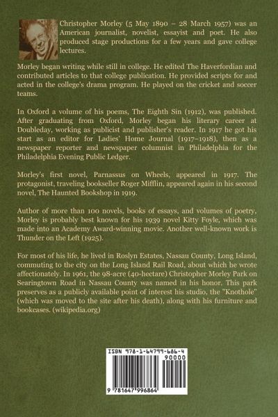 Christopher Morley (5 May 1890 - 28 March 1957) was an American journalist, novelist, essayist and poet. He also produced stage productions for a few years and gave college lectures. Morley began writing while still in college. He edited The Haverfordian and contributed articles to that college publication. He provided scripts for and acted in the college's drama program. He played on the cricket and soccer teams. In Oxford a volume of his poems, The Eighth Sin (1912), was published. After graduating from Oxford, Morley began his literary career at Doubleday, working as publicist and publisher's reader. In 1917 he got his start as an editor for Ladies' Home Journal (1917-1918), then as a newspaper reporter and newspaper columnist in Philadelphia for the Philadelphia Evening Public Ledger. Morley's first novel, Parnassus on Wheels, appeared in 1917. The protagonist, traveling bookseller Roger Mifflin, appeared again in his second novel, The Haunted Bookshop in 1919. He was one of the founders and a longtime contributing editor of the Saturday Review of Literature. A highly gregarious man, he was the mainstay of what he dubbed the "Three Hours for Lunch Club". Out of enthusiasm for the Sherlock Holmes stories, he helped found The Baker Street Irregulars and wrote the introduction to the standard omnibus edition of The Complete Sherlock Holmes. He also wrote an introduction to the standard omnibus edition of The Complete Works of Shakespeare in 1936, although Morley called it an "Introduction to Yourself as a Reader of Shakespeare". That year, he was appointed to revise and enlarge Bartlett's Familiar Quotations (11th edition in 1937 and 12th edition in 1948). He was one of the first judges for the Book of the Month Club, serving in that position until the early 1950s. Author of more than 100 novels, books of essays, and volumes of poetry, Morley is probably best known for his 1939 novel Kitty Foyle, which was made into an Academy Award-winning movie. Another well-known work is Thunder on the Left (1925). For most of his life, he lived in Roslyn Estates, Nassau County, Long Island, commuting to the city on the Long Island Rail Road, about which he wrote affectionately. In 1961, the 98-acre (40-hectare) Christopher Morley Park on Searingtown Road in Nassau County was named in his honor. This park preserves as a publicly available point of interest his studio, the "Knothole" (which was moved to the site after his death), along with his furniture and bookcases. (wikipedia.org)
