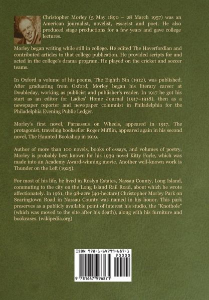 Christopher Morley (5 May 1890 - 28 March 1957) was an American journalist, novelist, essayist and poet. He also produced stage productions for a few years and gave college lectures. Morley began writing while still in college. He edited The Haverfordian and contributed articles to that college publication. He provided scripts for and acted in the college's drama program. He played on the cricket and soccer teams. In Oxford a volume of his poems, The Eighth Sin (1912), was published. After graduating from Oxford, Morley began his literary career at Doubleday, working as publicist and publisher's reader. In 1917 he got his start as an editor for Ladies' Home Journal (1917-1918), then as a newspaper reporter and newspaper columnist in Philadelphia for the Philadelphia Evening Public Ledger. Morley's first novel, Parnassus on Wheels, appeared in 1917. The protagonist, traveling bookseller Roger Mifflin, appeared again in his second novel, The Haunted Bookshop in 1919. He was one of the founders and a longtime contributing editor of the Saturday Review of Literature. A highly gregarious man, he was the mainstay of what he dubbed the "Three Hours for Lunch Club". Out of enthusiasm for the Sherlock Holmes stories, he helped found The Baker Street Irregulars and wrote the introduction to the standard omnibus edition of The Complete Sherlock Holmes. He also wrote an introduction to the standard omnibus edition of The Complete Works of Shakespeare in 1936, although Morley called it an "Introduction to Yourself as a Reader of Shakespeare". That year, he was appointed to revise and enlarge Bartlett's Familiar Quotations (11th edition in 1937 and 12th edition in 1948). He was one of the first judges for the Book of the Month Club, serving in that position until the early 1950s. Author of more than 100 novels, books of essays, and volumes of poetry, Morley is probably best known for his 1939 novel Kitty Foyle, which was made into an Academy Award-winning movie. Another well-known work is Thunder on the Left (1925). For most of his life, he lived in Roslyn Estates, Nassau County, Long Island, commuting to the city on the Long Island Rail Road, about which he wrote affectionately. In 1961, the 98-acre (40-hectare) Christopher Morley Park on Searingtown Road in Nassau County was named in his honor. This park preserves as a publicly available point of interest his studio, the "Knothole" (which was moved to the site after his death), along with his furniture and bookcases. (wikipedia.org)
