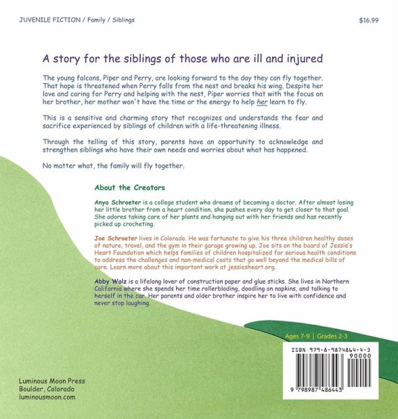 A story for the siblings of those who are ill and injured. The young falcons, Piper and Perry, are looking forward to the day they can fly together. That hope is threatened when Perry falls from the nest and breaks his wing. Despite her love and caring for Perry and helping with the nest, Piper worries that with the focus on her brother, her mother won't have the time or the energy to help her learn to fly. This is a sensitive and charming story that recognizes and understands the fear and sacrifice experienced by siblings of children with a life-threatening illness. Through the telling of this story, parents have an opportunity to acknowledge and strengthen siblings who have their own needs and worries about what has happened. No matter what, the family will fly together.