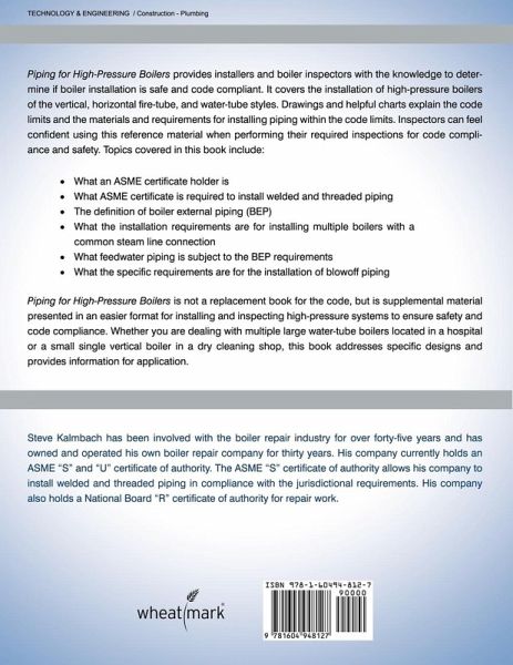 Piping for High-Pressure Boilers provides installers and boiler inspectors with the knowledge to determine if boiler installation is safe and code compliant. It covers the installation of high-pressure boilers of the vertical, horizontal fire-tube, and water-tube styles. Drawings and helpful charts explain the code limits and the materials and requirements for installing piping within the code limits. Inspectors can feel confident using this reference material when performing their required inspections for code compliance and safety. Topics covered in this book include: what an ASME certificate holder is, what ASME certificate is required to install welded and threaded piping, the definition of boiler external piping (BEP), what the installation requirements are for installing multiple boilers with a common steam line connection, what feedwater piping is subject to the BEP requirements, and what the specific requirements are for the installation of blowoff piping. Piping for High-Pressure Boilers is not a replacement book for the code, but is supplemental material presented in an easier format for installing and inspecting high-pressure systems to ensure safety and code compliance. Whether you are dealing with multiple large water-tube boilers located in a hospital or a small single vertical boiler in a dry cleaning shop, this book addresses specific designs and provides information for application.