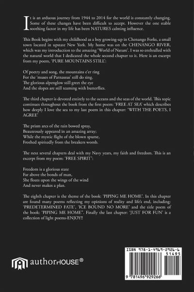 It is an arduous journey from 1944 to 2014 for the world is constantly changing. Some of these changes have been difficult to accept. However the one stable soothing factor in my life has been NATURES calming influence. This Book begins with my childhood as a boy growing-up in Chenango Forks, a small town located in upstate New York. My home was on the CHENANGO RIVER, which was my introduction to the amazing 'World of Nature'. I was so enthralled with the natural world that I dedicated the whole second chapter to it. Here is an excerpt from my poem, 'PURE MOUNTAINS STILL': Of poetry and song, the mountains e'er ring For the 'muses of Parnassus' still do sing. The glorious alpenglow still greet the eye And the slopes are still teaming with butterflies. The third chapter is devoted entirely to the oceans and the seas of the world. This topic continues throughout the book from the first poem: 'FREE AT SEA' which describes how deeply I love the sea to my last poem in this chapter: 'WITH THE POETS, I AGREE' The prism arcs of the rain bowed spray, Beauteously appeared in an amazing array; While the mystic flight of the blown spume, Frothed spiritedly from the breakers womb. The next several chapters deal with my Navy years, my faith and freedom. This is an excerpt from my poem: 'FREE SPIRIT': Freedom is a glorious state Far above the bonds of man, She floats upon the wings of the wind And never makes a plan. The eighth chapter is the theme of the book: 'PIPING ME HOME'. In this chapter are found many poems reflecting my opinions of reality and life's end, including: 'PREDETERMINED FATE', 'ICE BOUND NO MORE' and the title poem of the book: 'PIPING ME HOME". Finally the last chapter: 'JUST FOR FUN' is a collection of light poems-ENJOY!!