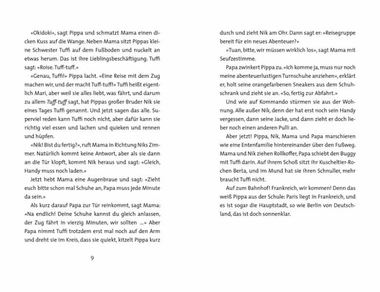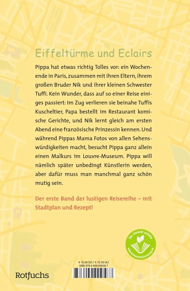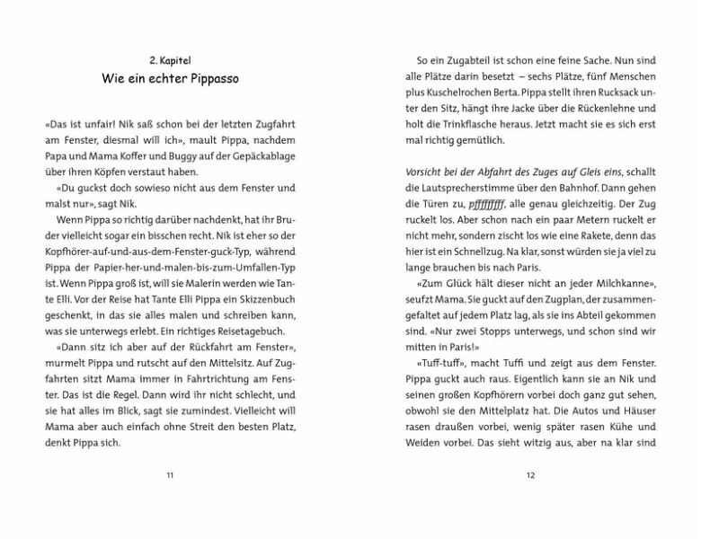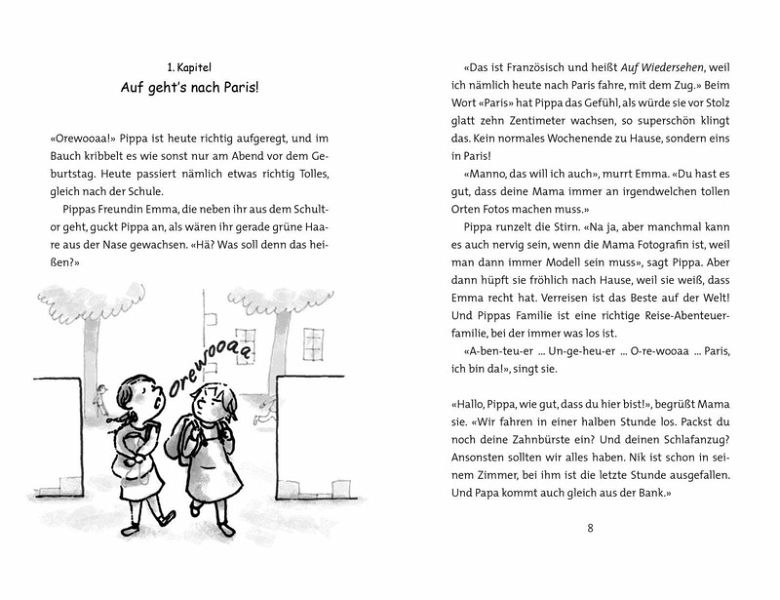 In der neuen Reisereihe mit Pippa und ihrer sympathischen Familie erfahren kleine Leser Städte mit allen Sinnen und lernen ganz nebenbei viel Wissenswertes. Mit Stadtplan und Rezept in jedem Band! Pippa hat etwas richtig Tolles vor: ein Wochenende in Paris, zusammen mit ihren Eltern, dem großen Bruder Nik und der kleinen Schwester Tuffi. Kein Wunder, dass auf so einer Reise einiges passiert: Gleich zu Anfang hätten sie fast Tuffis Kuschelrochen im Zug verloren, Papa bestellt seltsame Gerichte im Restaurant, obwohl sein Französisch doch sooo gut ist, und Nik lernt gleich am ersten Abend eine französische Prinzessin kennen. Die große Frage ist nur: Wird Pippa sich wirklich trauen, allein den Malkurs im Louvre-Museum zu besuchen, den Mama schon zu Hause für sie gebucht hat? Pippa will nämlich unbedingt Künstlerin werden, aber dafür muss man manchmal ziemlich mutig sein.