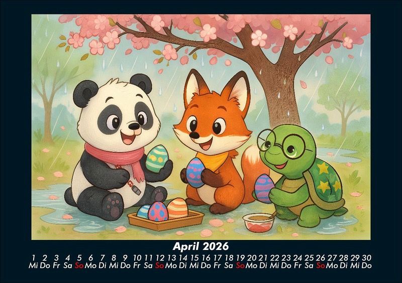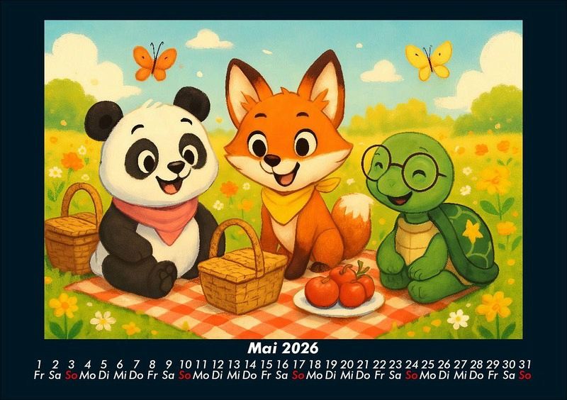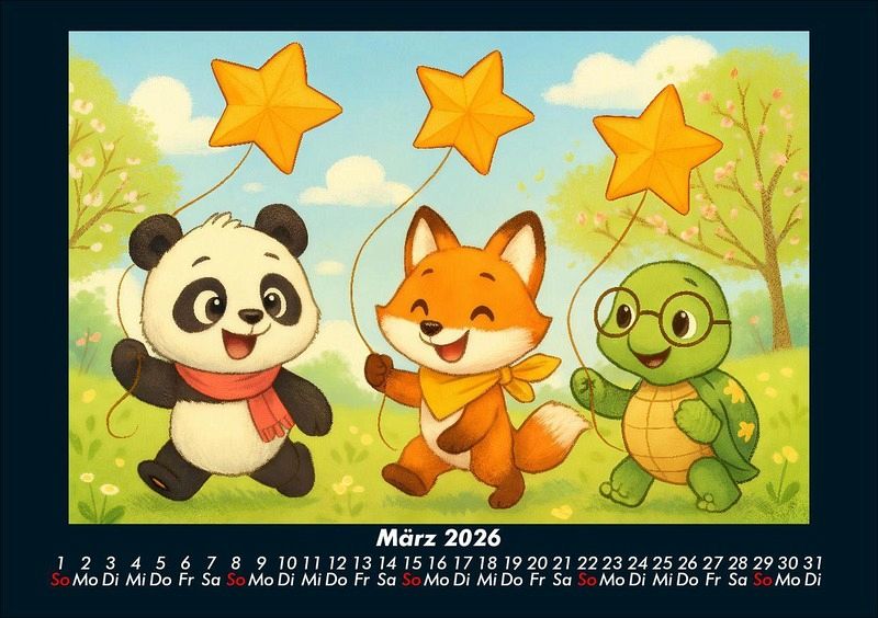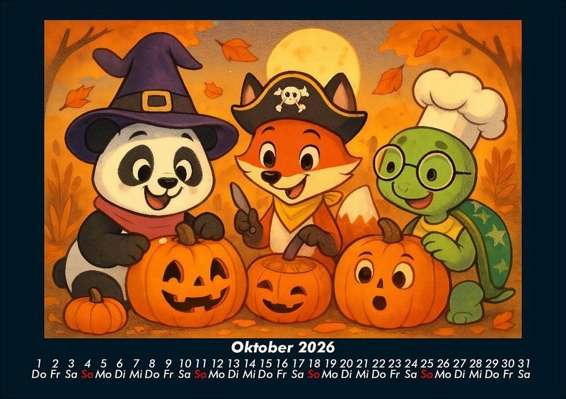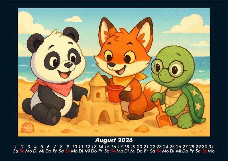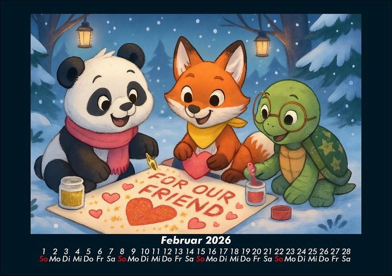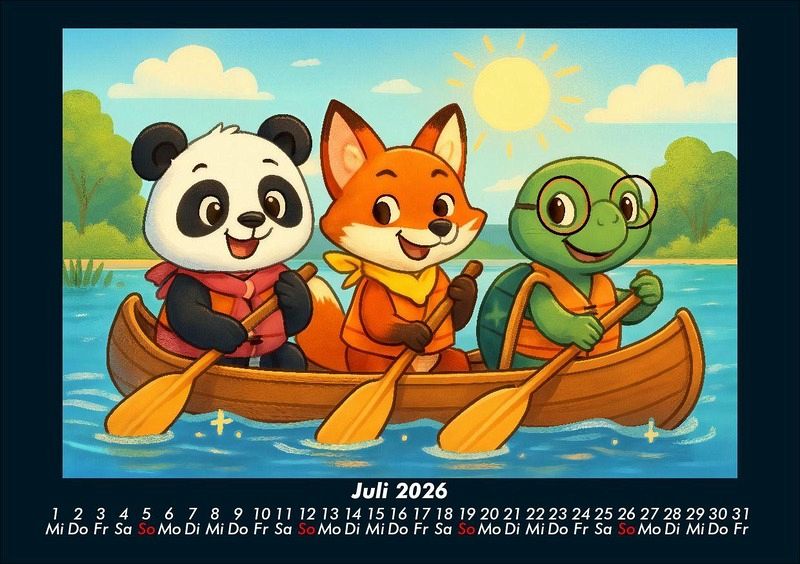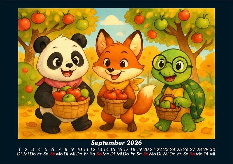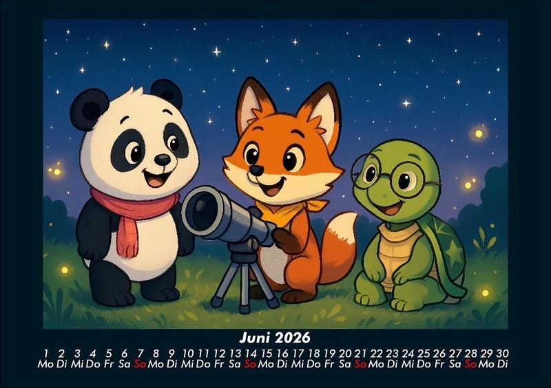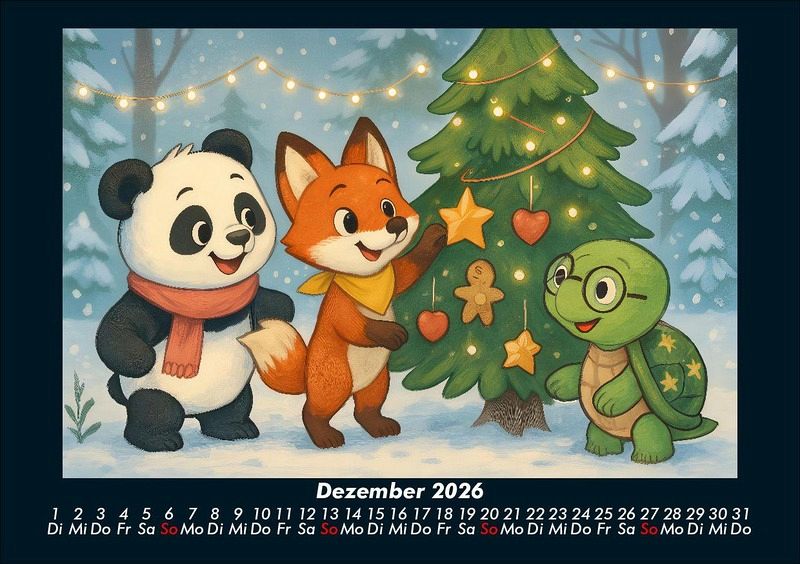 Pippin, Finn & Taz - Freunde im Zauberwald 2026 Motivkalender DIN A5 Pippin der Panda, Finn der schlaue Fuchs und Taz die nachdenkliche Schildkröte entdecken die Jahreszeiten in einem magischen Cartoon-Stil. Von Schlittenfahrten im Winter über Picknick und Kanufahrten im Sommer bis hin zur Apfelernte und Weihnachtszeit - drei unzertrennliche Freunde erleben Natur, Feste und Abenteuer. Vero-Kalender Kids zeigen liebevoll gestaltete Monatskalender mit bunten Bild-Motiven tierischer Freunde, die gemeinsam spannende Abenteuer erleben und die Welt entdecken. Ob in fernen Ländern, zwischen berühmten Sehenswürdigkeiten oder in magischen Landschaften - die fröhlichen Tiercharaktere begleiten Kinder Monat für Monat durch ein Jahr voller Fantasie, Freude und Freundschaft. Gedruckt werden die Kinder-Kalender aus dem Vero Verlag auf hochwertigem Kalenderbogen in Premium-Qualität und in verschiedenen Größen.