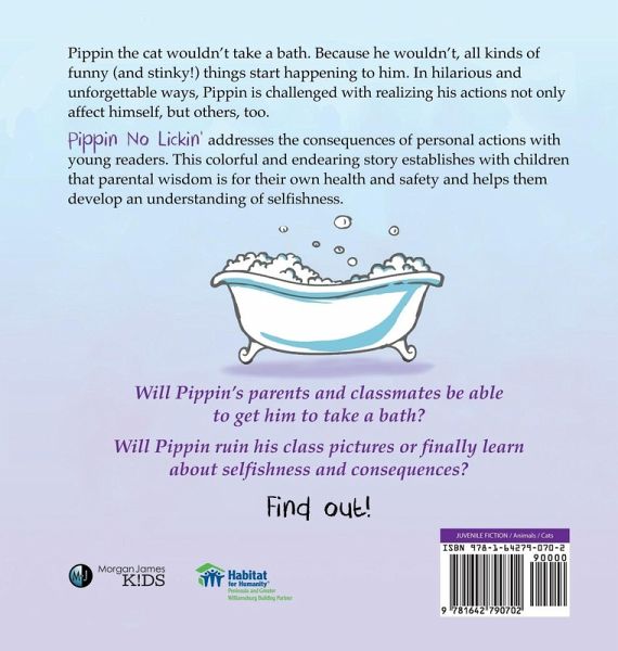 Pippin the cat wouldn¿t take a bath. Because he wouldn¿t, all kinds of funny (and stinky!) things start happening to him. In hilarious and unforgettable ways, Pippin is challenged with realizing his actions not only affect himself, but others, too. Will his parents and classmates get him to change his mind? Pippin, No Lickin¿ addresses the consequences of personal actions with young readers. This colorful and endearing story establishes with children that parental wisdom is for their own health and safety and helps them develop an understanding of selfishness. Pippin¿s adventures even teach colors to very young readers along the way! Parents and children alike will enjoy this introduction to an immediately classic and memorable character in Pippin the cat.