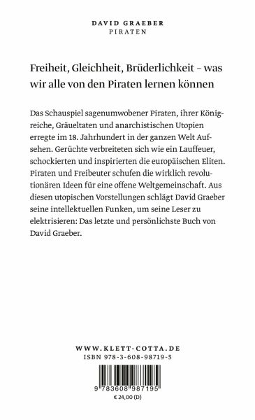Das Schauspiel sagenumwobener Piraten, ihrer Königreiche, Gräueltaten und anarchistischen Utopien erregte im 18. Jahrhundert in der ganzen Welt Aufsehen. Gerüchte verbreiteten sich wie ein Lauffeuer, schockierten und inspirierten die europäischen Eliten. Piraten und Freibeuter schufen die wirklich revolutionären Ideen für eine offene Weltgemeinschaft. Dieses utopische Potential elektrisierte David Graeber und lässt seine intellektuellen Funken auf seine Leser überspringen.