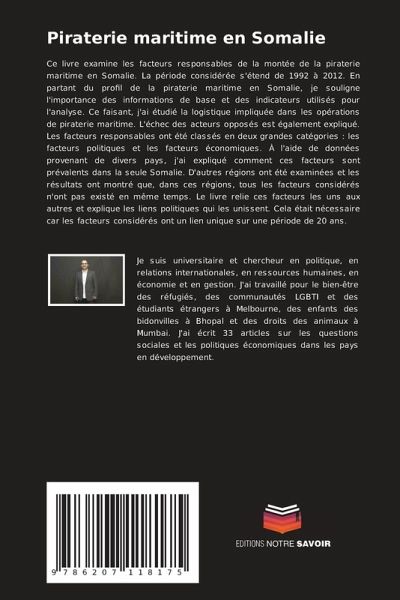 Ce livre examine les facteurs responsables de la montée de la piraterie maritime en Somalie. La période considérée s'étend de 1992 à 2012. En partant du profil de la piraterie maritime en Somalie, je souligne l'importance des informations de base et des indicateurs utilisés pour l'analyse. Ce faisant, j'ai étudié la logistique impliquée dans les opérations de piraterie maritime. L'échec des acteurs opposés est également expliqué. Les facteurs responsables ont été classés en deux grandes catégories : les facteurs politiques et les facteurs économiques. À l'aide de données provenant de divers pays, j'ai expliqué comment ces facteurs sont prévalents dans la seule Somalie. D'autres régions ont été examinées et les résultats ont montré que, dans ces régions, tous les facteurs considérés n'ont pas existé en même temps. Le livre relie ces facteurs les uns aux autres et explique les liens politiques qui les unissent. Cela était nécessaire car les facteurs considérés ont un lien unique sur une période de 20 ans.