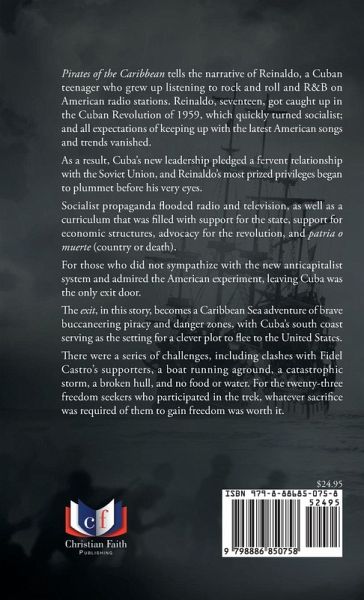 Pirates of the Caribbean tells the narrative of Reinaldo, a Cuban teenager who grew up listening to rock and roll and RandB on American radio stations. Reinaldo, seventeen, got caught up in the Cuban Revolution of 1959, which quickly turned socialist; and all expectations of keeping up with the latest American songs and trends vanished. As a result, Cuba's new leadership pledged a fervent relationship with the Soviet Union, and Reinaldo's most prized privileges began to plummet before his very eyes. Socialist propaganda flooded radio and television, as well as a curriculum that was filled with support for the state, support for economic structures, advocacy for the revolution, and patria o muerte (country or death). For those who did not sympathize with the new anticapitalist system and admired the American experiment, leaving Cuba was the only exit door. The exit, in this story, becomes a Caribbean Sea adventure of brave buccaneering piracy and danger zones, with Cuba's south coast serving as the setting for a clever plot to flee to the United States. There were a series of challenges, including clashes with Fidel Castro's supporters, a boat running aground, a catastrophic storm, a broken hull, and no food or water. For the twenty-three freedom seekers who participated in the trek, whatever sacrifice was required of them to gain freedom was worth it.