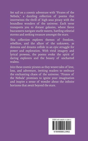 Set sail on a cosmic adventure with "Pirates of the Nebula," a dazzling collection of poems that intertwines the thrill of high-seas piracy with the boundless wonders of the universe. Each verse transports you to distant galaxies, where fierce buccaneers navigate starlit waters, battling celestial storms and seeking treasure amongst the stars. This collection explores themes of freedom, rebellion, and the allure of the unknown, as demons and dreams collide in an epic struggle for power and exploration. With vivid imagery and lyrical prowess, the poems evoke the spirit of daring explorers and the beauty of uncharted realms. Join these cosmic pirates as they weave tales of love, loss, and adventure, inviting readers to embrace the enchanting chaos of the universe. "Pirates of the Nebula" promises to ignite your imagination and inspire a sense of wonder about the infinite horizons that await beyond the stars.