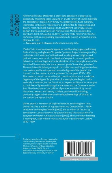 'Pirates? The Politics of Plunder is a first-rate collection of essays on a perennially interesting topic. Drawing on a wide variety of source materials, the contributors explore how piracy was legally defined and culturally interpreted in the early modern period. Striking for its geographical and generic reach, the book explores texts as different as Portuguese epic, English drama, and narratives of North African Muslims enslaved by Christians. Fresh scholarship and lively writing make Pirates? The Politics of Plunder both an outstanding contribution to current scholarship and a pleasure to read.' - Professor Jean E. Howard, Columbia University, USA