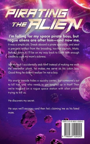 I'm falling for my space pirate boss, but rogue aliens are after him-and now me. It was a simple job. Sneak aboard a pirate spaceship and steal a precious artifact from the brooding, too-hot captain, Matis. Before I know it, I'll be on my way back to Earth with enough credits to cure my mom's sickness. Is it my fault I accidentally stab him? Instead of making me walk the interstellar plank, he makes me serve as his cabin boy. Good thing he doesn't realize I'm not a boy. His snarly outside hides a squishy center, but someone's out to kill him, and who needs to get tangled up in that? Then we're trapped on a rogue space station with alien pirates trying to kill us. He discovers my secret. He says we'll escape-and then he's claiming me as his fated mate.