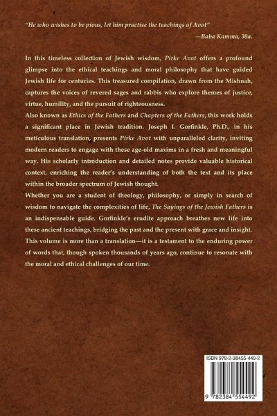 "He who wishes to be pious, let him practise the teachings of Avot"-Baba Kamma, 30a. In this timeless collection of Jewish wisdom, Pirke Avot offers a profound glimpse into the ethical teachings and moral philosophy that have guided Jewish life for centuries. This treasured compilation, drawn from the Mishnah, captures the voices of revered sages and rabbis who explore themes of justice, virtue, humility, and the pursuit of righteousness.Also known as Ethics of the Fathers and Chapters of the Fathers, this work holds a significant place in Jewish tradition. Joseph I. Gorfinkle, Ph.D., in his meticulous translation, presents Pirke Avot with unparalleled clarity, inviting modern readers to engage with these age-old maxims in a fresh and meaningful way. His scholarly introduction and detailed notes provide valuable historical context, enriching the reader's understanding of both the text and its place within the broader spectrum of Jewish thought.Whether you are a student of theology, philosophy, or simply in search of wisdom to navigate the complexities of life, The Sayings of the Jewish Fathers is an indispensable guide. Gorfinkle's erudite approach breathes new life into these ancient teachings, bridging the past and the present with grace and insight.This volume is more than a translation-it is a testament to the enduring power of words that, though spoken thousands of years ago, continue to resonate with the moral and ethical challenges of our time.