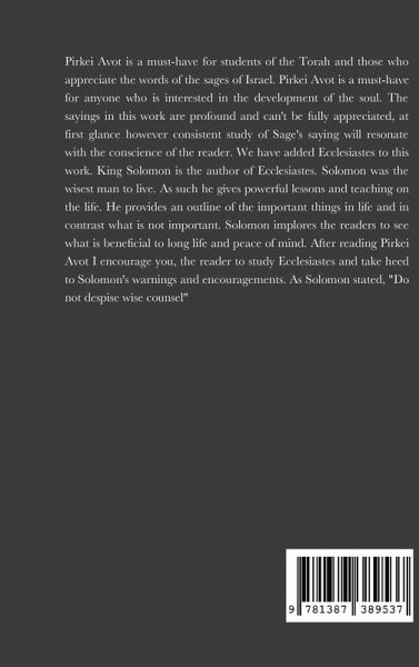 Pirkei Avot is a must-have for anyone who is interested in the development of the soul. The sayings in this work are profound and can't be fully appreciate at first glance however consistent study of the Sages saying will resonate with the conscience of the reader. We have added Ecclesiastes to this work. King Solomon is the author of Ecclesiastes. Solomon was the wisest man to live. As such he gives powerful lessons and teaching on the life. He provides an outline of the important things in life and in contrast what is not important. Solomon implores the readers to see what is beneficial to long life and peace of mind. After reading Pirkei Avot I encourage you, the reader to study Ecclesiastes and take heed to Solomon's warnings and encouragements. As Solomon stated, "Do not despise wise counsel"
