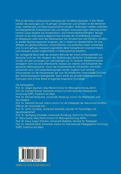 Vorwort des Vorsitzenden des PISA-Beirats PISA ist die bisher umfassendste und differenzierteste Vergleichsuntersuchung zum Leis tungsstand von Schulerinnen und Schulern. In der Bundesrepublik Deutschland sind ins gesamt uber 50.000 Schulerinnen und Schuler an fast 1.500 Schulen in die Untersuchun gen einbezogen worden. Es ist ein gutes Zeichen fUr das konstruktive Engagement von Schulerinnen und Schulern, Lehrkraften und Eltern wie auch fUr die Professionalitat der Wissenschaftlerinnen und Wissenschaftler, die diese Untersuchungen durchfUhren, dass die Erhebungen in den Schulen ohne Probleme…mehr