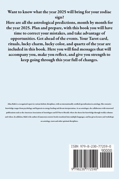 Want to know what the year 2025 will bring for your zodiac sign? Here are all the astrological predictions, month by month for the year 2025. Plan and prepare, with this book you will have time to correct your mistakes, and take advantage of opportunities. Get ahead of the events. Your Tarot card, rituals, lucky charm, lucky color, and quartz of the year are included in this book. Here you will find messages that will accompany you, make you reflect, and give you strength to keep going through this year full of changes.