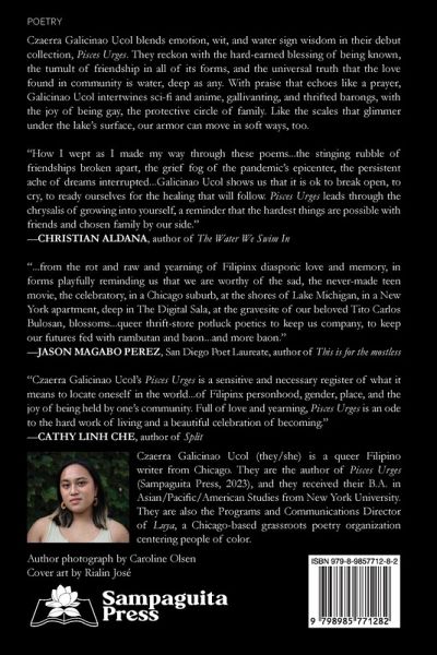 Czaerra Galicinao Ucol blends emotion, wit, and water sign wisdom in their debut collection, Pisces Urges. They reckon with the hard-earned blessing of being known, the tumult of friendship in all of its forms, and the universal truth that the love found in community is water, deep as any. With praise that echoes like a prayer, Galicinao Ucol intertwines sci-fi and anime, gallivanting, and thrifted barongs, with the joy of being gay, the protective circle of family. Like the scales that glimmer under the lake's surface, our armor can move in soft ways, too.