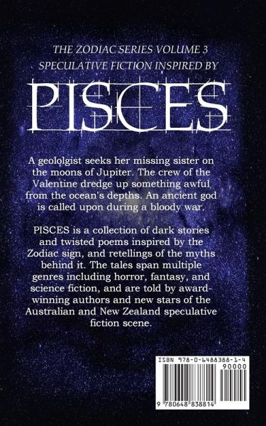 A geologist seeks her missing sister on the moons of Jupiter. The crew of the Valentine dredge up something awful from the ocean's depths. An ancient God is called upon during a bloody war. PISCES is a collection of twisted poems and dark stories inspired by this fascinating Zodiac sign, as well as retellings of the myths behind the sign. The tales span multiple genres, including science fiction, horror, fantasy, dystopian and urban fantasy, told by some award-winning authors and new stars of the Australian and New Zealand speculative fiction scene. This anthology is the third volume in The Zodiac Series, with each volume focusing on a particular sign of the Zodiac.
