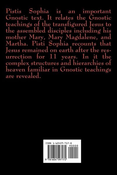 Pistis Sophia is an important Gnostic text. It relates the Gnostic teachings of the transfigured Jesus to the assembled disciples including his mother Mary, Mary Magdalene, and Martha. Pisti Sophia recounts that Jesus remained on earth after the resurrection for 11 years. In it the complex structures and hierarchies of heaven familiar in Gnostic teachings are revealed.