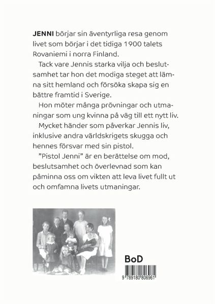 JENNI börjar sin äventyrliga resa genom livet som börjar i det tidiga 1900 talets Rovaniemi i norra Finland. Tack vare Jennis starka vilja och beslutsamhet tar hon det modiga steget att lämna sitt hemland och försöka skapa sig en bättre framtid i Sverige. Hon möter många prövningar och utmaningar som ung kvinna på väg till ett nytt liv. Mycket händer som påverkar Jennis liv, inklusive andra världskrigets skugga och hennes försvar med sin pistol. ¿Pistol Jenni¿ är en berättelse om mod, beslutsamhet och överlevnad som kan påminna oss om vikten att leva livet fullt ut och omfamna livets utmaningar.
