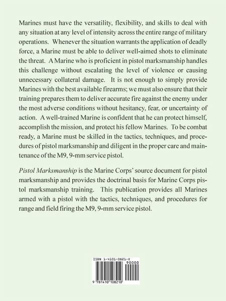 Marines must have the versatility, flexibility, and skills to deal with any situation at any level of intensity across the entire range of military operations. Whenever the situation warrants the application of deadly force, a Marine must be able to deliver well-aimed shots to eliminate the threat. A Marine who is proficient in pistol marksmanship handles this challenge without escalating the level of violence or causing unnecessary collateral damage. It is not enough to simply provide Marines with the best available firearms; we must also ensure that their training prepares them to deliver accurate fire against the enemy under the most adverse conditions without hesitancy, fear, or uncertainty of action. A well-trained Marine is confident that he can protect himself, accomplish the mission, and protect his fellow Marines. To be combat ready, a Marine must be skilled in the tactics, techniques, and procedures of pistol marksmanship and diligent in the proper care and maintenance of the M9, 9-mm service pistol. Pistol Marksmanship is the Marine Corps' source document for pistol marksmanship and provides the doctrinal basis for Marine Corps pistol marksmanship training. This publication provides all Marines armed with a pistol with the tactics, techniques, and procedures for range and field firing the M9, 9-mm service pistol.