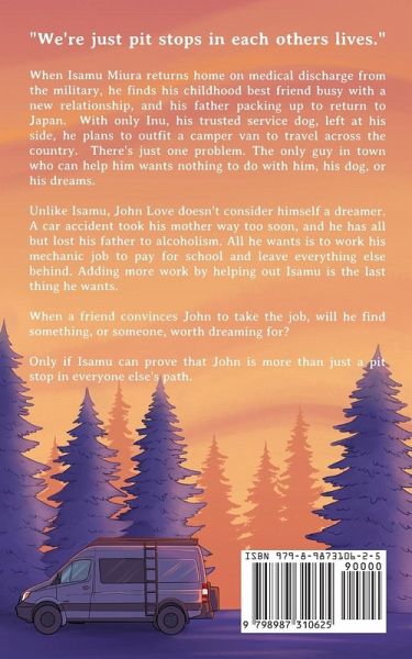 When Isamu Miura returns home on medical discharge from the military, he finds his childhood best friend busy with a new relationship, and his father packing up to return to Japan. With only Inu, his trusted service dog, left at his side, he plans to outfit a camper van to travel across the country. There's just one problem. The only guy in town who can help wants nothing to do with him, his dog, or his dreams. Unlike Isamu, John Love doesn't consider himself a dreamer. A car accident took his mother way too soon, and he has all but lost his father to alcoholism. All he wants is to work his mechanic job to pay for school and leave everything else behind. Adding more work by helping out Isamu is the last thing he wants. When a friend convinces John to take the job, will he find something, or someone, worth dreaming for? Only if Isamu can prove that John is more than just a pit stop on everyone else's path.