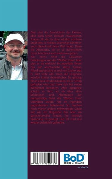 Dies sind die Geschichten des kleinen, aber doch schon ziemlich erwachsenen Jungen Pit, der in einer wirklich schönen Stadt lebt, in Holiday. Allerdings könnte er auch überall auf dieser Welt leben. Denn die Abenteuer, die er so durchstehen muss, könnte es auch anderswo geben. Wer kennt nicht die seltsamen Erzählungen von der "Weißen Frau". Aber gibt es sie wirklich? Pit jedenfalls findet das auf anschauliche Weise heraus. Allerdings besucht er auch ein Casino. Was er dort wohl will? Doch die Ereignisse werden immer dramatischer. So gelangt Pit an einen Ort des Grauens, wo er richtig gefordert wird und muss sich bei einem Wettkampf bewähren. Aber irgendwie scheint es ihm, als ob über allen Erlebnissen und Abenteuern der merkwürdige Geist der "Weißen Frau" schweben würde. Hat sie irgendein unglaubliches Geheimnis? So tauchen noch manch andere merkwürdige Dinge auf, wie ein fliegender Bus oder ein geheimnisvoller Tempel. Für reichlich Spannung ist gesorgt und Pit wird mal wieder ordentlich gefordert.