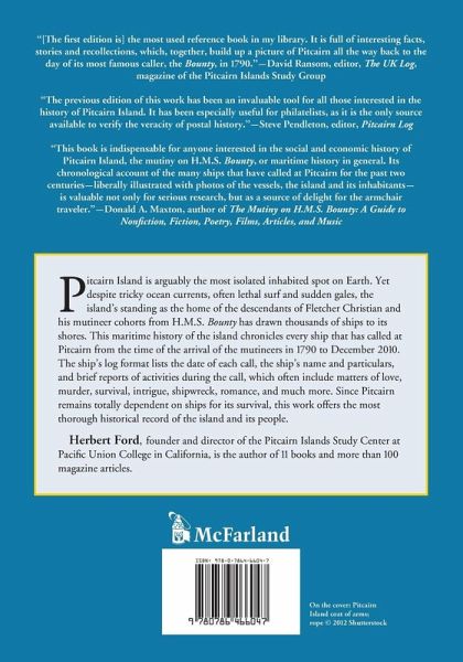 Pitcairn Island is arguably the most isolated inhabited spot on Earth. Yet despite tricky ocean currents, often lethal surf and sudden gales, the island's standing as the home of the descendants of Fletcher Christian and his mutineer cohorts from H.M.S. Bounty has drawn thousands of ships to its shores. This maritime history of the island chronicles every ship that has called at Pitcairn from the time of the arrival of the mutineers in 1790 to December 2010. The ship's log format lists the date of each call, the ship's name and particulars, and brief reports of activities during the call, which often include matters of love, murder, survival, intrigue, shipwreck, romance, and much more. Since Pitcairn remains totally dependent on ships for its survival, this work offers the most thorough historical record of the island and its people.