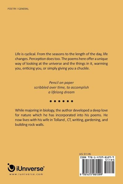 Life is cyclical. From the seasons to the length of the day, life changes. Perception does too. The poems here offer a unique way of looking at the universe and the things in it, warming you, enticing you, or simply giving you a chuckle. Pencil on paper scribbled over time, to accomplish a lifelong dream