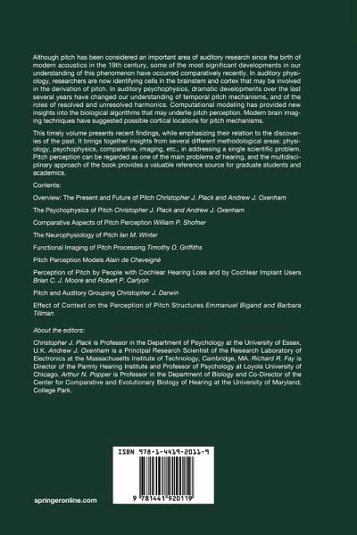 This timely volume brings together the more recent findings, while emphasizing their relation to the discoveries of the past. It brings together insights from several different methodologicalareas: physiology, psychophysics, comparative, imaging, etc., in addressing a single scientific problem. Pitch perception can be regarded as one of the main problems of hearing, and the multidisciplinary approach of the book provides a valuable reference source for graduate students and academics.