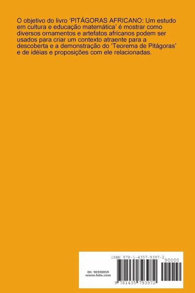 O objetivo do livro 'PITÁGORAS AFRICANO: Um estudo em cultura e educação matemática' é mostrar como diversos ornamentos e artefatos africanos podem ser usados para criar um contexto atraente para a descoberta e a demonstração do 'Teorema de Pitágoras' e de idéias e proposições com ele relacionadas. (122 p., a cores)