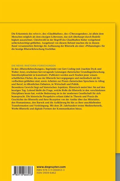 Aristoteles definiert die Rhetorik "als das Vermögen, bei jedem Gegenstand das möglicherweise Glaubhafte zu sehen". Die Erkenntnis des jeweiligen pi th ni ni, des "Glaubhaften", des "Überzeugenden", ist dabei allein dem Menschen möglich als dem einzigen Lebewesen, das sich überhaupt durch Redefähigkeit auszeichnet. Gleichwohl ist der Begriff des Glaubhaften, das pi th ni ni selbst, bisher weitgehend unberücksichtigt geblieben. Ausgehend von diesem Befund machen die in diesem Band versammelten Beiträge die Auffassung der Rhetorik als einer "Pithanologie" fruchtbar für die heutige Rhetorikforschung, insbesondere für die Anthropologie des homo rhetoricus und die Fundamentalrhetorik.