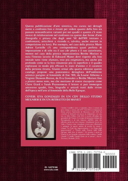 Giunto ormai alla quarta edizione questo catalogo propone una panoramica dettagliata dell'ambiente artistico parigino al femminile di fine '800, da Louise Abbema a Virginie Demont-Breton, da Eva Gonzales a Berthe Morisot fino a pittrici meno note, ma che meritano di essere riscoperte come Claire Giard e Sarah Peyssonneau il lettore si può immergere attraverso quadri, foto, biografie e articoli tratti dalle riviste dell'epoca nell'arte al femminile della Belle Epoque. COVER: COVER: Eva Gonzales in un cdv photo dello studio Mulnier di Parigi appartenente alla mia collezione di foto originali d'epoca e la stessa Gonzales su un palco a teatro in un quadro del suo maestro Edouard Manet.