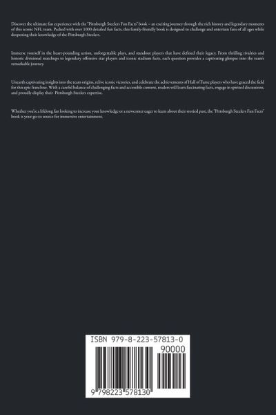 Discover the ultimate fan experience with the "Pittsburgh Steelers Fun Facts" book – an exciting journey through the rich history and legendary moments of this iconic NFL team. Packed with over 1000 detailed fun facts, this family-friendly book is designed to challenge and entertain fans of all ages while deepening their knowledge of the Pittsburgh Steelers. Immerse yourself in the heart-pounding action, unforgettable plays, and standout players that have defined their legacy. From thrilling rivalries and historic divisional matchups to legendary offensive star players and iconic stadium facts, each question provides a captivating glimpse into the team's remarkable journey. Unearth captivating insights into the team origins, relive iconic victories, and celebrate the achievements of Hall of Fame players who have graced the field for this epic franchise. With a careful balance of challenging facts and accessible content, readers will learn fascinating facts, engage in spirited discussions, and proudly display their Pittsburgh Steelers expertise. Whether you're a lifelong fan looking to increase your knowledge or a newcomer eager to learn about their storied past, the "Pittsburgh Steelers Fun Facts" book is your go-to source for immersive entertainment.