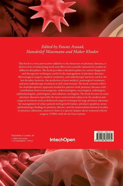 This book is a very provocative addition to the literature on pituitary diseases, it delivers lots of stimulating work and offers rich scientific material for readers in different disciplines. The book provides a detailed update on current diagnostic and therapeutic techniques useful in the management of pituitary diseases. Microsurgical surgery, medical treatment, and radiotherapy has been used in the last decades; however, the prediction of post-medical, postsurgical treatment, and post-radiotherapy treatment is still controversial. The book contents reflect the multidisciplinary approach needed for patients with pituitary diseases with contribution from neurosurgeons, endocrinologists, neurologists, radiologists, ophthalmologists, pathologists, and radiation oncologists. The book focuses on some pituitary diseases especially the most controversial subjects in the medical and surgical treatment such as dedicated surgical technique by huge pituitary adenoma, the management of celiac patients with growth failure, pituitary apoplexy, neuro ophthalmology findings in pituitary disease, and the immunohistochemical studies in pituitary adenomas, moreover there is a special chapter about transoral robotic surgery (TORS) with the da Vinci system.
