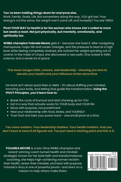 Pivot Your Way to Health: Reclaim Your Power. Take Control of Your Health. Lead With Purpose. By Yolanda Moore DESCRIPTION: What if the real key to transforming your health wasn't in a meal plan or workout-but in the way you lead your life? Pivot Your Way to Health is a thought leadership guide for high-achieving women who are ready to stop putting their wellness on the back burner. With bold honesty, science-backed insight, and biblical wisdom, Yolanda Moore-two-time WNBA champion, award-winning coach, and health and mindset strategist-invites you to reclaim your power, rewrite your health story, and take radical ownership of your well-being. After losing 82 pounds during menopause, two layoffs, and facing eviction as a single mom of four, Yolanda didn't just change her body-she transformed her mind, her habits, and her life. Now, she's handing you the blueprint. This isn't a weight loss book. It's a wake-up call. Inside, you'll discover:The PIVOT Principles that fuel lasting health and leadership transformation How your leadership style and personality patterns affect your wellness decisions Why self-sabotage is spiritual-and how to finally break the cycle How to align your faith, biology, and behavior for results that stick Practical tools, reflection charts, and mindset shifts that move you from burnout to breakthrough Whether you're navigating menopause, carrying the weight of leadership, or just tired of starting over-this book equips you to pivot with purpose, prioritize your health without guilt, and lead a life you don't need to escape from. God doesn't want you sick. In order to lead well, you have to be well.