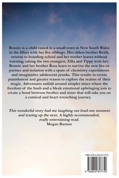 Bonnie is a child raised in a small town in New South Wales in the fifties with her five siblings. Her oldest brother Keith, returns to boarding school and her mother leaves without warning, taking the two youngest, Zilla and Tippy with her. Bonnie and her brother Ross learn to survive the new live-in partner and isolation with a spate of chemistry experiments and imaginative adolescent pranks. This results in severe punishment and greater reason to explore the realms of their magic. Adventures unfold around simpler times where the freedom of the bush and a bleak emotional upbringing join to create a bond between brother and sister that will take you on a comical and heart wrenching journey.