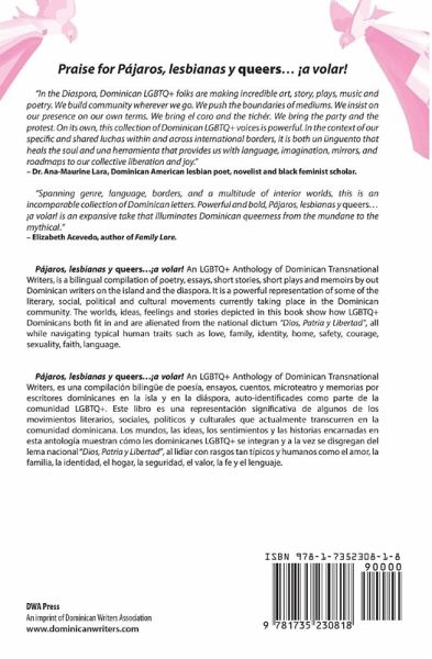 Pájaros, lesbianas y queers...¡a volar! An LGBTQ+ Anthology of Dominican Transnational Writers, is a bilingual compilation of poetry, essays, short stories, short plays and memoirs by out Dominican writers on the island and the diaspora. It is a powerful representation of some of the literary, social, political and cultural movements currently taking place in the Dominican community. The worlds, ideas, feelings and stories depicted in this book show how LGBTQ+ Dominicans both fit in and are alienated from the national dictum "Dios, Patria y Libertad", all while navigating typical human traits such as love, family, identity, home, safety, courage, sexuality, faith, language. Pájaros, lesbianas y queers...¡a volar! An LGBTQ+ Anthology of Dominican Transnational Writers, es una compilación bilingüe de poesía, ensayos, cuentos, microteatro y memorias por escritores dominicanes en la isla y en la diáspora, auto-identificades como parte de la comunidad LGBTQ+. Este libro es una representación significativa de algunos de los movimientos literarios, sociales, políticos y culturales que actualmente transcurren en la comunidad dominicana. Los mundos, las ideas, los sentimientos y las historias encarnadas en esta antología muestran cómo les dominicanes LGBTQ+ se integran y a la vez se disgregan del lema nacional "Dios, Patria y Libertad", al lidiar con rasgos tan típicos y humanos como el amor, la familia, la identidad, el hogar, la seguridad, el valor, la fe y el lenguaje.