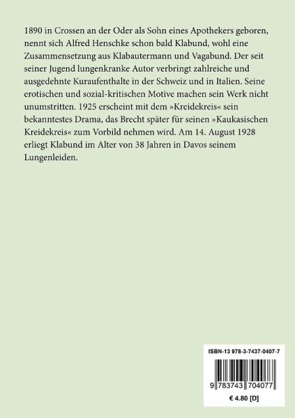1890 in Crossen an der Oder als Sohn eines Apothekers geboren, nennt sich Alfred Henschke schon bald Klabund, wohl eine Zusammensetzung aus Klabautermann und Vagabund. Der seit seiner Jugend lungenkranke Autor verbringt zahlreiche und ausgedehnte Kuraufenthalte in der Schweiz und in Italien. Seine erotischen und sozial-kritischen Motive machen sein Werk nicht unumstritten. 1925 erscheint mit dem "Kreidekreis" sein bekanntestes Drama, das Brecht später für seinen "Kaukasischen Kreidekreis" zum Vorbild nehmen wird. Am 14. August 1928 erliegt Klabund im Alter von 38 Jahren in Davos seinem Lungenleiden.