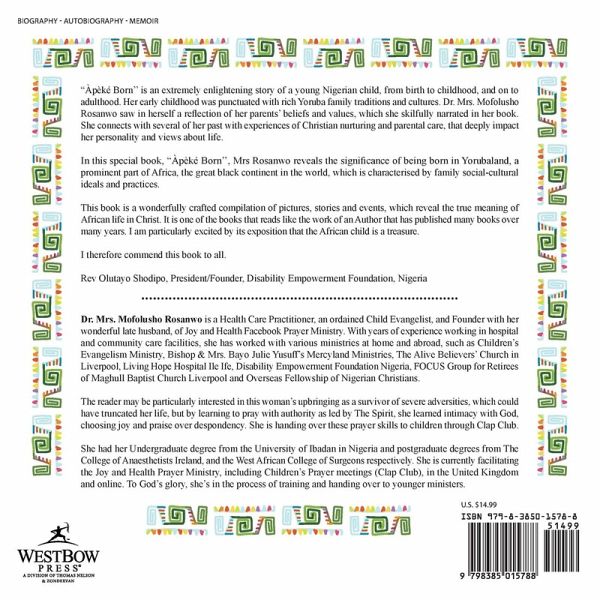 ''Àpèké Born'' is an extremely enlightening story of a young Nigerian child, from birth to childhood, and on to adulthood. Her early childhood was punctuated with rich Yoruba family traditions and cultures. Dr. Mrs. Mofolusho Rosanwo saw in herself a reflection of her parents' beliefs and values, which she skilfully narrated in her book. She connects with several of her past with experiences of Christian nurturing and parental care, that deeply impact her personality and views about life. In this special book, ''Àpèké Born'', Mrs Rosanwo reveals the significance of being born in Yorubaland, a prominent part of Africa, the great black continent in the world, which is characterised by family social-cultural ideals and practices. This book is a wonderfully crafted compilation of pictures, stories and events, which reveal the true meaning of African life in Christ. It is one of the books that reads like the work of an Author that has published many books over many years. I am particularly excited by its exposition that the African child is a treasure. I therefore commend this book to all. Rev Olutayo Shodipo, President/Founder, Disability Empowerment Foundation, Nigeria