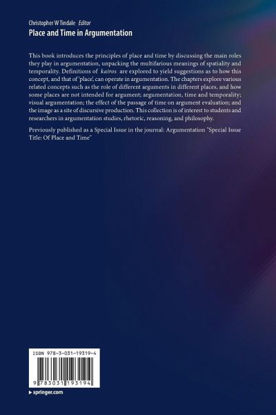 This book introduces the principles of place and time by discussing the main roles they play in argumentation, unpacking the multifarious meanings of spatiality and temporality. Definitions of kairos are explored to yield suggestions as to how this concept, and that of 'place', can operate in argumentation. The chapters explore various related concepts such as the role of different arguments in different places, and how some places are not intended for argument; argumentation, time and temporality; visual argumentation; the effect of the passage of time on argument evaluation; and the image as a site of discursive production. This collection is of interest to students and researchers in argumentation studies, rhetoric, reasoning, and philosophy.