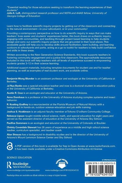 Benjamin Wong Blonder, Ph.D. is an assistant professor and ecologist at the University of California at Berkeley. Ja'Nya Banks, M.Ed. was a special education teacher and now is a doctoral student in education policy at the University of California at Berkeley. Austin R. Cruz, M.A. is an ecologist and educator at the University of Arizona. Anna Dornhaus, Ph.D. is a professor at the University of Arizona studying complex systems and insect behavior. R. Keating Godfrey, Ph.D. is a neuroscientist at the Florida Museum of Natural History with a background in hands-on, outdoor science education and job skills training. Joshua S. Hoskinson, M.S., M.A. is an adjunct faculty member at Tohono O'odham Community College. Rebecca Lipson taught middle school science, math, and special education for eight years and served as the assistant director of education at the University of Arizona Sky School. Pacifica Sommers, Ph.D. is an ecologist and educator at the University of Colorado at Boulder. Christy Coverdale Stewart, M.Ed. has 35 years of experience as a middle and high school science teacher, curriculum specialist, and teacher coach. Alan Strauss, Ph.D. has a background in disability studies and is the director of the University of Arizona's Mount Lemmon Science Center and Sky School.