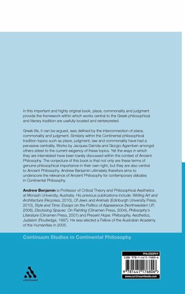 In this important and highly original book, place, commonality and judgment provide the framework within which works central to the Greek philosophical and literary tradition are usefully located and reinterpreted. Greek life, it can be argued, was defined by the interconnection of place, commonality and judgment. Similarly within the Continental philosophical tradition topics such as place, judgment, law and commonality have had a pervasive centrality. Works by Jacques Derrida and Giorgio Agamben amongst others attest to the current exigency of these topics. Yet the ways in which they are interrelated has been barely discussed within the context of Ancient Philosophy. The conjecture of this book is that not only are these terms of genuine philosophical importance in their own right, but they are also central to Ancient Philosophy. Andrew Benjamin ultimately therefore aims to underscore the relevance of Ancient Philosophy for contemporary debates in Continental Philosophy.