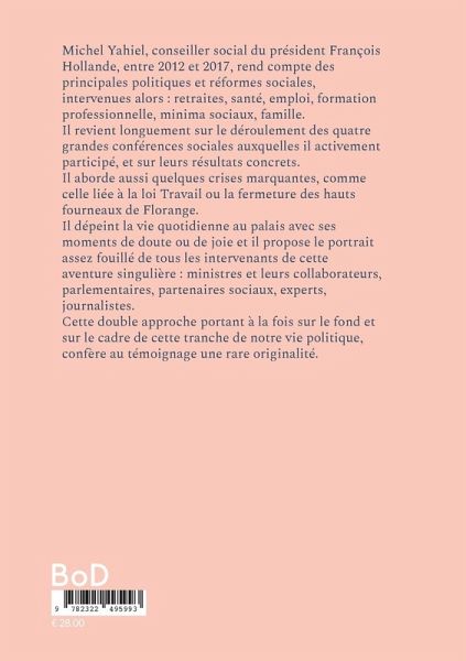Michel Yahiel, conseiller social du président François Hollande, entre 2012 et 2017, rend compte des principales politiques et réformes sociales, intervenues alors : retraites, santé, emploi, formation professionnelle, minima sociaux, famille. Il revient longuement sur le déroulement des quatre grandes conférences sociales auxquelles il activement participé, et sur leurs résultats concrets. Il aborde aussi quelques crises marquantes, comme celle liée à la loi Travail ou la fermeture des hauts fourneaux de Florange. Il dépeint la vie quotidienne au palais avec ses moments de doute ou de joie et il propose le portrait assez fouillé de tous les intervenants de cette aventure singulière : ministres et leurs collaborateurs, parlementaires, partenaires sociaux, experts, journalistes. Cette double approche portant à la fois sur le fond et sur le cadre de cette tranche de notre vie politique, confère au témoignage une rare originalité.
