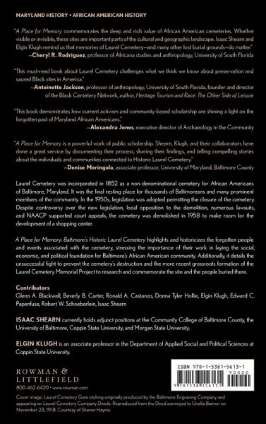 Preface Acknowledgments Chapter 1: The Story of Laurel Cemetery Authors: Elgin Klugh and Isaac Shearn PART ONE Chapter 2: "Where Have All the Flowers Gone?" Resurrecting Baltimore's Laurel Cemetery Author: Edward C. Papenfuse Chapter 3: Laurel Cemetery: Key to Unlocking Baltimore's African American History Author: Donna Tyler Hollie Chapter 4: Creating a Legacy of Activism Author: Beverly B. Carter Chapter 5: "Gather around their sacred remains": An Overview of the Laurel National Cemetery Author: Robert W. Schoeberlein Chapter 6: Not Without a Fight: The Decline and Closure of Laurel Cemetery Author: Isaac Shearn PART TWO Chapter 7: Public Archaeology at Laurel Cemetery Author: Ronald A. Castanzo Chapter 8: Archival Research: Reconstructing the burial population of Laurel Cemetery Author: Glenn A. Blackwell Chapter 9: Reconciling the Landscape: Public Engagement and Placemaking at the site of Laurel Cemetery Author: Elgin Klugh Chapter 10: Afterword Author: Elgin Klugh Bibliography