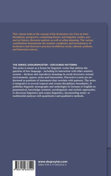 This volume looks at the concept of the declarative city from an interdisciplinary perspective, comprising literary and linguistic studies, arts and art history, discourse analysis, as well as urban planning. The various contributions demonstrate the semiotic complexity and inconsistency of declarative and discursive practices in different social, cultural, aesthetic, and historical contexts.