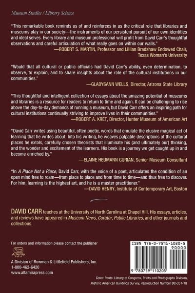 Would that all cultural or public officials had David Carr's ability, even determination, to observe, to explain, and to share insights about the role of our cultural institutions in our communities. -- GladysAnn Wells, Arizona State Librarian This remarkable book reminds us of and reinforces in us the critical role that libraries and museums play in our society - instruments of our persistent pursuit of our own identities and ideal selves. Every library and museum professional will profit from David Carr's thoughtful observations and careful articulation of what really goes on within our walls. -- Robert S. Martin, Professor and Lillian Bradshaw Endowed Chair, Texas Woman?s University David Carr writes using beautiful, often poetic words that emulate the elusive magical act of learning that he writes about. Into his writing, he weaves palpable descriptions of the cultural places he extols, carefully chosen theorists that illuminate his (and ultimately our) thinking, and the wonder and excitement of the learners. His book is a journey we get caught up in and become enriched by. -- Elaine Heumann Gurian, Senior Museum Consultant In A Place, Not a Place, David Carr, with the voice of a poet, articulates the condition of an open mind free to roam - from place to place and from time to time - and thus free to discover. For him, learning is the highest art, and he is a master practitioner. -- David Henry, Institute of Contemporary Art Boston Once again David Carr has written a book that gently challenges us to rethink the mission of our cultural institutions. He reminds us that a library or a museum has an almost mysterious power over a community and that these public spaces offer each individual and each community a promise that is ineffable but real. As a practicing librarian, I find David Carr's insightful and provocative essays to be a refreshing change from the "how-to" books that are so commonly found on the shelves of librarians. If you want to understand the future of cultural institutions, throw away the how-to books and read A Place Not a Place. -- Steve Sumerford, Greensboro Public Library This thoughtful and intelligent collection of essays about the amazing potential of museums and libraries is a resource for readers to return to time and again. It can be challenging to rise above the day-to-day demands of running a museum, but David Carr offers an inspiring path for cultural institutions continually striving to improve lives in their communities. -- Robert A. Kret, Director, Hunter Museum of American Art The value of this book is Carr's passionate commitment to the possibilities within cultural institutions and his insistence that we aspire to actualize them in our own work, lives, and institutions. L&Cr The book itself is terrific...a bedside read every bit as much as deserving a place (on) the office bookshelf. Texas Association Of Museums, September 2008